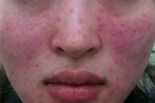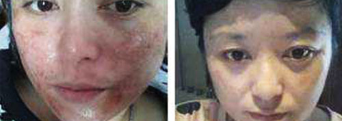 治疗前:31岁的赵女士喜欢用名贵的化妆品。不久前她的脸上出现了一些小疙瘩,就涂一些外用药。用了以后她发现病情缓解了,有的小疙瘩也消失了。可是,一停药就复发。