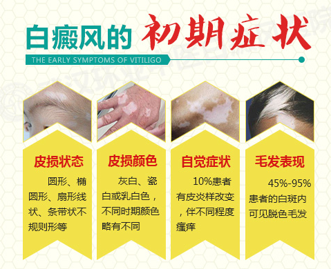 白癜风早期很少发生毛发变白的症状,如果病情得不到及时空盒子,发病时间一久,毛发可变白,甚至脱落。白癜风早期白斑多为指甲至钱币大,近圆形、椭圆形或不规则形,也有起病时为点状减色斑,境界多;有的边缘绕以色素带,早期大部分白癜风患者白斑面积较小,有极少数患者早期发病就很快,迅速演变为泛发性白癜风,白斑面积扩至全身。
