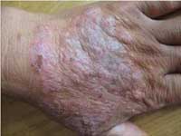 3、慢性湿疹:多因急性、亚急性湿疹反复发作演变而成。皮肤常年瘙痒难耐,患处皮肤浸润增厚,变成暗红色及色素沉着。皮损纹变粗大,表现干燥而易发生皲裂。