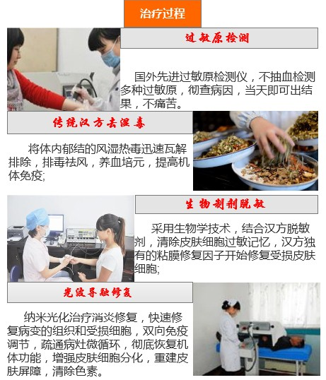 治疗原理:中药去除体内湿毒,结合生物共振技术,通过纳米萃取绿色脱敏制剂,快速脱敏,同时利用纳米光波导融定位渗透脱敏治疗,消炎脱敏,修复受损表皮,增强表皮微循环和抵抗力。