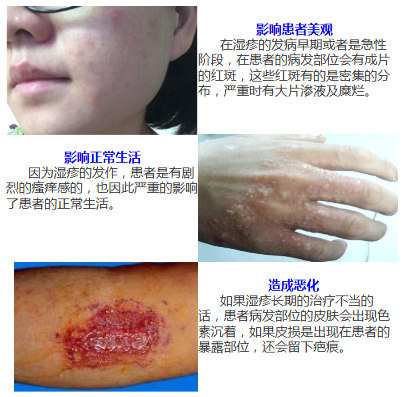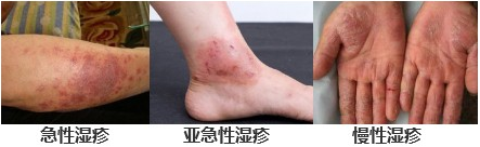1、急性湿疹:发病急,皮损初为多数密集的粟粒大小的丘疹、丘疱疹或小水疱,基底潮红,瘙痒剧烈。