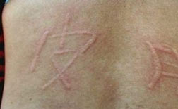 病症:皮肤发痒、用指甲划过后,局部先出现一道道的红斑风团,随即风团水肿高出皮肤,并在红斑风团的边缘出现红晕现象。